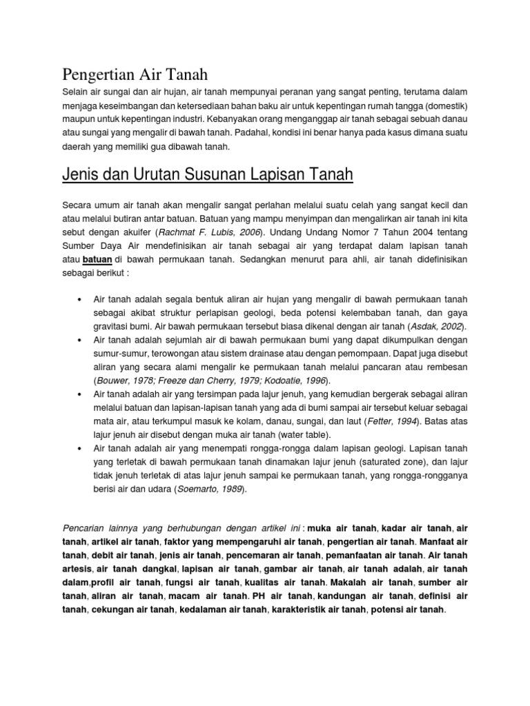 Secara ilmiah, air bisa diartikan sebagai sebuah senyawa kimia yang terdiri dari dua unsur, yaitu unsur h2 (hidrogen) yang berikatan dengan unsur o2 (oksigen) yang kemudian menghasilkan senyawa air (h2o). Secara umum pengertian air tanah adalah bagian air yang berada pada lapisan di bawah permukaan tanah. Pengertian pencemaran air beserta penyebab dan dampaknya. Air tanah pengertian air tanah sendiri menurut chandra (2006) dalam buku pengantar kesehatan lingkungan adalah sebagian air hujan yang mencapai permukaan bumi dan menyerap ke dalam lapisan tanah dan menjadi air tanah. Air menutupi lebih dari 70% permukaan bumi.